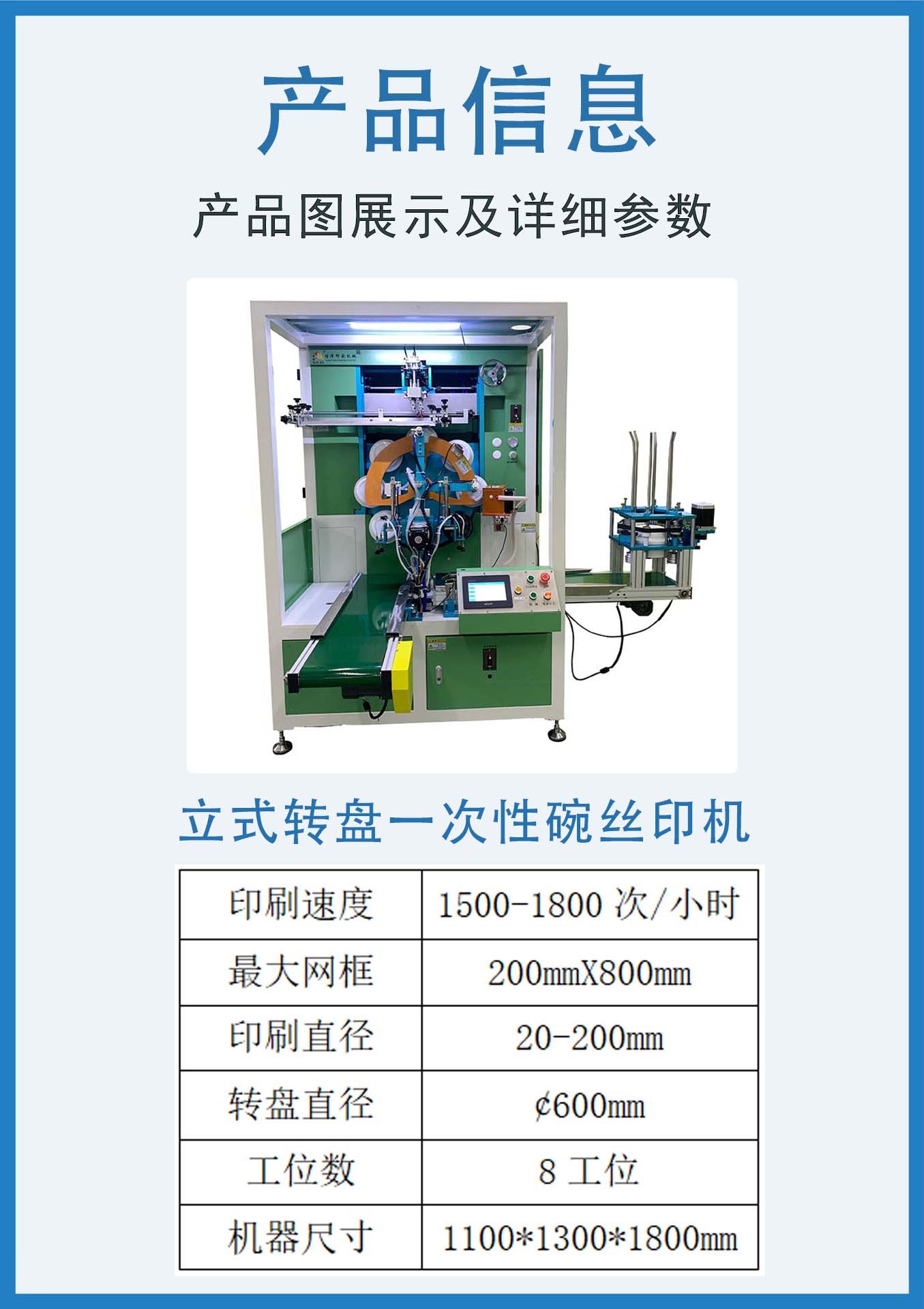 立式轉盤一(yī)次碗是一(yī)款為(wèi)高(gāo)速度,高(gāo)精密度絲印而設計的全自(zì)動圓型産品絲印機(jī),根據全聯杆式機(jī)械結構,電(diàn)機(jī)驅動,高(gāo)速運行沒有任何的震動,滿足客戶的高(gāo)精密度、高(gāo)品質的要求。 采用機(jī)械手自(zì)動供料,經高(gāo)精密凸輪分割器(qì)運送産品進行印前表面處理,機(jī)械手上(shàng)料至夾具轉送絲網印刷,被印刷産品表面直接通(tōng)過UV裝置瞬間固化,機(jī)械手自(zì)動下(xià)料。